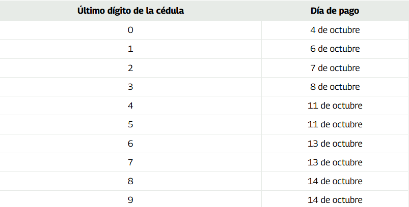 Las fechas de cobro se establecen según el último dígito de la cédula de identidad del titular.